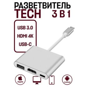 Многопортовый кабель-адаптер TECH разветвлитель Type-C - 3 в 1 представляет собой уникальное устройство, которое объединяет в себе функции нескольких аксессуаров. Он позволяет передавать изображение со смартфона, планшета, ноутбука или компьютера с порта USB-C на телевизор, монитор или проектор со входом HDMI.