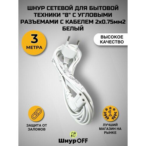 Найти - Шнур сетевой для бытовой техники 8 с угловыми разъемами с кабелем 2x0.75мм2 3 метра, белый