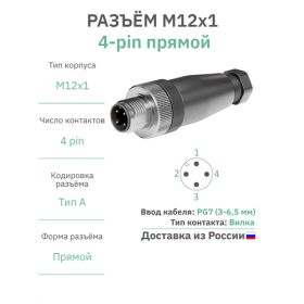 Найти - Разъём М12 4 pin прямой / вилка (папа) / PG7 (3-6,5 мм диаметр под кабель) / модель RAZM-M12-C4