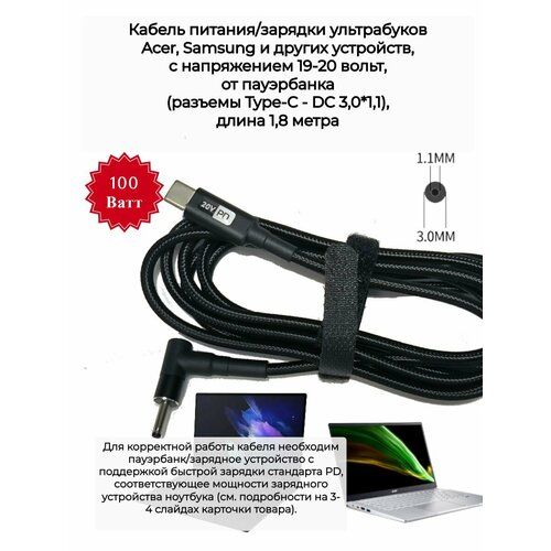 НАЙТИ ВЫГОДНЕЕ - Кабель зарядки (питания) 20 Вольт от пауэрбанка с поддержкой быстрой зарядки (DC 3,0*1,1, 5А) для ультрабуков Acer, Samsung