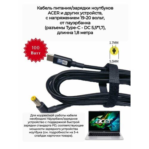 НАЙТИ ВЫГОДНЕЕ - Кабель зарядки (питания) 20 Вольт от пауэрбанка с поддержкой быстрой зарядки (DC 5,5*1,7, 5А) для ноутбуков Acer