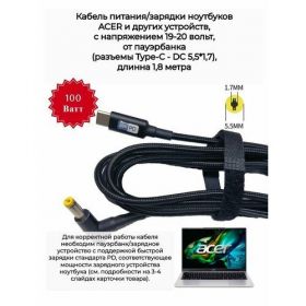 5. Походит для автономного питания/зарядки от пауэрбанка или иных зарядных устройств (поддерживающих стандарт быстрой зарядки PD), ноутбуков Acer. Поддерживаемая мощность потребителя питания до 100 Ватт (сила тока до 5А).