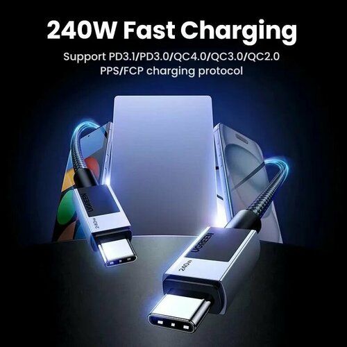 Кабель оснащен разъемами USB Type-C и поддерживает стандарты быстрой зарядки, включая FCP (Huawei), Power Delivery и Quick Charge. Максимальная мощность зарядки составляет 240 Вт, что позволяет быстро зарядить ваш смартфон или другое устройство.