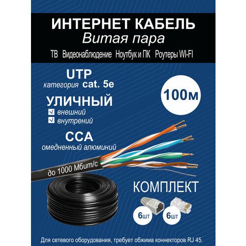Комплектация: Кабель UTP4 уличный 100 метров, Коннектор RJ-45 - 6 штуки, колпачок rj45 - 6 штуки