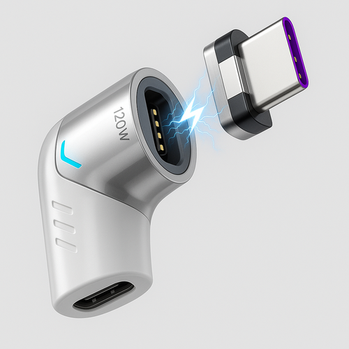 Магнитный адаптер оснащен угловым разъемом, что позволяет удобно разместить его на любом устройстве с разъемом USB Type-C. Это обеспечивает надежное крепление кабеля и предотвращает его случайное отсоединение.