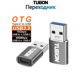 Переходник адаптер OTG TUBON USB3.2 USB - Type-C 10Gbps/480Mbps 60W AUS02 Серый оснащен разъемами USB Type-A (M) и USB Type-C (F), что позволяет подключать различные устройства с соответствующими разъемами.