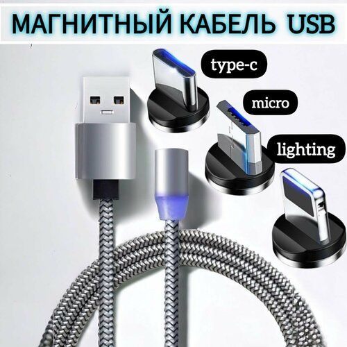 Найти - Магнитный USB-кабель 3 в 1 с тремя насадками Lightning, micro USB, Type C , серебристый