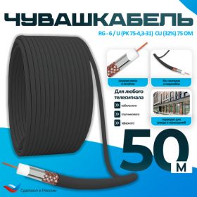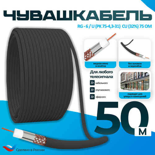 Найти - Кабель антенный для телевизора RG-6/U (РК 75-4,3-31) Cu (32%) 75 Ом, коаксиальный, черный 50 м