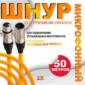 Высококачественный микрофонный кабель XLR PREMIUM ORANGE (male-female) OD 6.5 мм 50 метров производства компании PROCABLE-AV представляет собой балансный экранированный микрофонный кабель, оснащенный надежными 3-контактными металлическими PRO разъемами XLR. Корпус штекера из цинкового сплава с покрытием черный + серебристый штифт-чистое медное золото с медным покрытием.