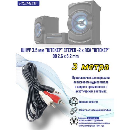Шнур jack 3.5мм стерео штекер - 2 RCA штекер предназначен для передачи аналогового аудиосигнала и широко применяется в акустических системах.