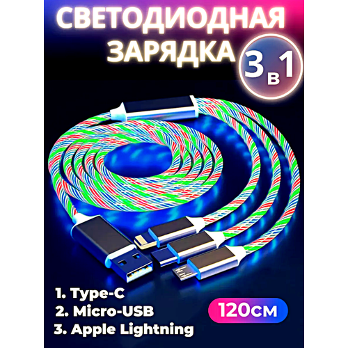 Найти - Зарядный кабель светящийся 3 в 1, Зарядный кабель с подсветкой и 3 разъемами MicroUSB, Type-C, Lightning, 120см, цветной