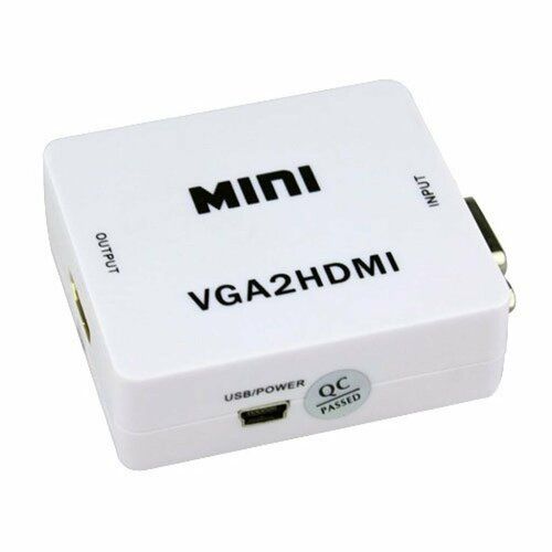 VGA > HDMI Переходник конвертер адаптер с vga аналогового входа на цифровой hdmi работает только с дополнительным питанием Также может передавать звук, на ваш телевизор для этого подайте звук на вход 3.5 jack конвертора Подключи видеокарту с VGA к монитору HDMI или проектору со входом HDMI Комплект адаптер , кабель питания Обеспечивает прогрессивную обработку сигналов точность, цветной, разрешение и детали Высокое качество технология преобразования, Вход VGA поддерживает до 1920x1080 @ 60 Гц и аудио вход jack 3,5 мм Выходной порт: HDMI Размер: 66 (D) x55 (Ш) X20 (H) (мм) Вес:40 5(г). Материалы: пластик Поддержка 640x480 на 60 Гц, 800x600 на 60 Гц, 1024x768 на 60 Гц, 1280x720 на 60 Гц 1280x768 на 60 Гц, 1280x800 на 60 Гц 1280x960 на 60 Гц, 1280x1024 на 60 Гц 1360x768 на 60 Гц, 1440x900 на 60 Гц 1600x1200 на 60 Гц, 1920x1080 на 60 Гц, выходное разрешение 1080p/60 Гц, 720p/60 Гц. Комплект Конвертер + кабель питания USB mini USB Может питаться от любого активного USB входа или блока Питания Usb 5В 1A Версия HDMI 1.4b внимание