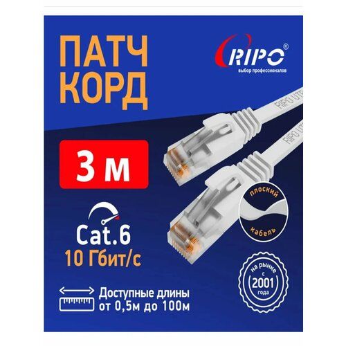 НАЙТИ ВЫГОДНЕЕ - Кабель для подключения интернета 3 м ютп4 кат6 лан провод интернет, патч корд плоский, витая пара UTP4 Cat6 RJ45 3 метра RIPO ССА белый 003-300140