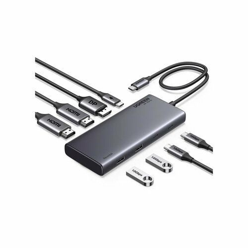 Док-станция 8-в-1 для ноутбуков с USB-C от Ugreen оснащена двумя портами HDMI 4K, одним портом DisplayPort 4K, двумя портами USB-C 3.2 Gen 2 и двумя портами USB-A 3.2 Gen 2 с высокой скоростью передачи данных 10 Гбит/с, а также поддержкой Power Delivery мощностью 100 Вт.