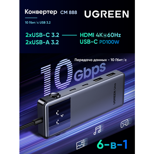 Конвертер UGREEN CM888 (35998) UNO 6-in-1 4K@60Hz USB-C To HDMI+2*USB 3.2 A+2*USB 3.2 C+PD Power Converter - это многофункциональное устройство, которое объединяет в себе множество полезных функций.