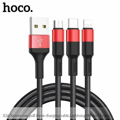 Найти - Кабель Hoco 3в1 USB - Lightning/ Type-C/ Micro для Iphone, смартфонов, Hoco X26, чёрный с красным, 1 метр, 2A