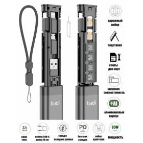 Мультикабель длиной 18 см включает 6 типов кабелей с поддержкой протокола быстрой зарядки Power Delivery. Кабель USB C - USB C длиной 18 см. 3 типа переходников - USB A - USB C, USB C - Micro-USB, USB C - Lightning. Также 4 слота для microSD карточек, 2 слота для nanoSIM, скрепка для извлечение SIM карт и шнурок для переноски. Кабель может использоваться и для зарядки гаджетов - поддержка PD до 65Вт, а также для передачи данных на скорости 480 Мбит/c.