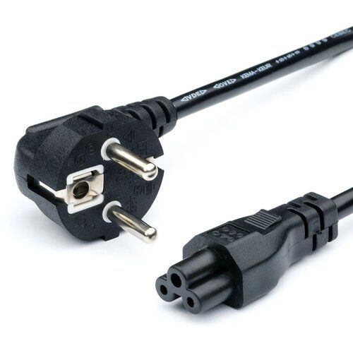 Кабель питания предназначается для подключения устройств с разъемом C6 (мониторов, ноутбуков, проекторов) к бытовым и производственным электрическим сетям, напряжением 220 В. Используется кабель типа ПВС длиной изделия 1.8 метра черного цвета. Конструкция кабеля - 3 скрученные многопроволочные жилы из омедненного алюминия с сечением 0.75 мм2 с поливинилхлоридной изоляцией, в оболочке из поливинилхлорида, на напряжение 220 В. Материал разъемов - ПВХ черного цвета. Материал контактов в разъемах - латунь, покрытая цинком. Есть провод заземления.