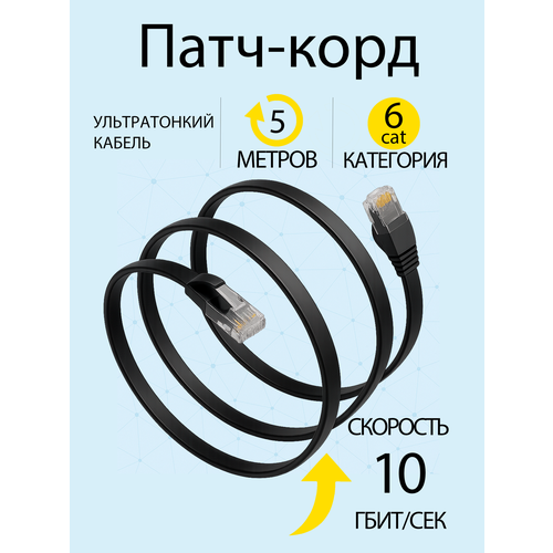 НАЙТИ ВЫГОДНЕЕ - Патч корд 5м категория 6 rj45, плоский, черный, сетевой интернет кабель