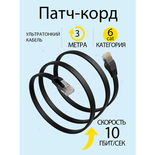 НАЙТИ ВЫГОДНЕЕ - Патч корд 3 метра категория 6 rj45, плоский, черный, сетевой интернет кабель
