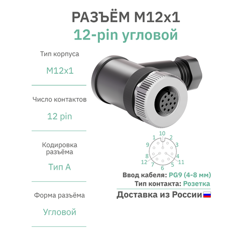 Найти - Разъём М12 12 pin угловой / розетка (мама) / PG9 (6-8 мм диаметр под кабель) / модель RAZM-F12-C12A-PG9