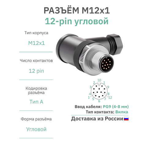Найти - Разъём М12 12 pin угловой / вилка (папа) / PG9 (6-8 мм диаметр под кабель) / модель RAZM-M12-C12A-PG9