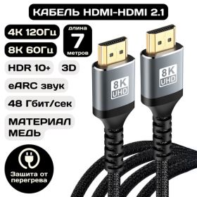 Найти - Кабель HDMI 2.1 8К 60Гц и 4K 120Гц на 7 метров / Видеокабель HDMI нейлоновый с поддержкой HDR и eARC