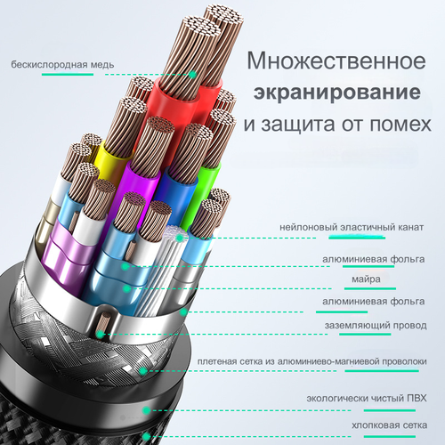 Подтягивающий резистор 56K для безопасной зарядки встроенный резистор 56 кОм обеспечивает безопасную зарядку и защищает ваши устройства и зарядные адаптеры от повреждений и перегрузки по току, более толстый медный провод 24AWG значительно минимизирует потерю сигнала, а экранирование фольгой и оплеткой обеспечивает надежное, безошибочное качество сигнала и защиту от электромагнитных/радиочастотных помех, что в комплексе обеспечивает длительный срок службы.