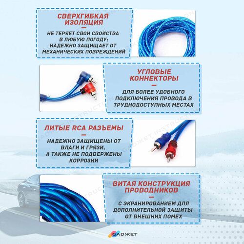 Главными элементами межблочника являются проводник, изолятор и штекеры. Кабель акустический медный представляет из себя два провода для передачи «правого» и «левого» канала. RCA − это самые распространенные в сфере бытового аудио, Hi-Fi и Hi-End небалансные аудио разъемы, также именуемые как тюльпаны на сабвуфер или усилитель. Наш rca кабель автомобильный от Gadжет состоит из двух коаксиальных, раздельно изолированных, сваренных по одной примыкающей стороне кабельных каналов. Центральная жила каждого из каналов состоит из десяти проводников диаметром по 0,07 mm каждый. Снаружи изолированная центральная жила покрыта экраном. Внешняя плотная изоляция синего (прозрачного) цвета изготовлена из прочного ПВХ. Общий диаметр провода − 4,0 mm.