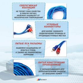 Для определения полярности подключения, литые (изготовленные из PVC) RCA разъемы окрашены в два цвета (красный и синий). Все внутренние проводники кабеля изготовлены из чистой OFC меди 99.9%. Благодаря термостойкой внешней изоляции, провод может использоваться в широком диапазоне температур: от −40С до +70С. Также наши тюльпаны провода для автозвука очень гибкие и хорошо защищены от внешних механических и климатических воздействий.
