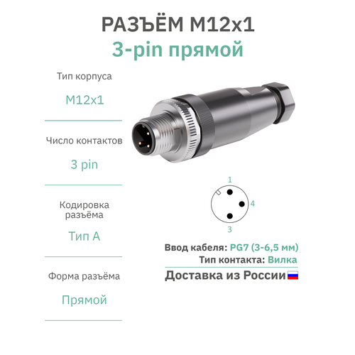 НАЙТИ ВЫГОДНЕЕ - Разъём М12 3 pin прямой / вилка (папа) / PG7 (3-6,5 мм диаметр под кабель) / модель RAZM-M12-C3