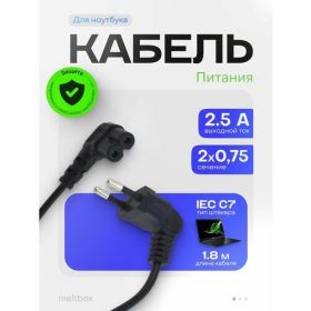 Данный сетевой шнур состоит из двухжильного провода с сечением жил 0.75мм, с одной стороны угловой литой плоской вилки (Евро) и с другой стороны углового литого разъем типа С8