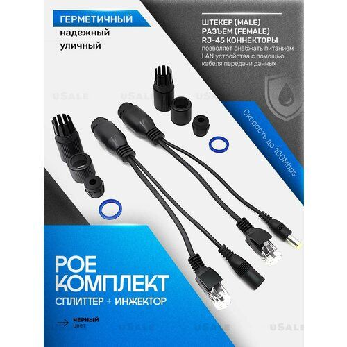 Poe-комплект (Пое-комплект) сплиттер + инжектор, идеально подходящий для использования в уличных условиях. Этот герметичный комплект обеспечивает надежное подключение и питание устройств, поддерживающих PoE, в любых климатических условиях. Он станет отличным решением для подключения IP-камер, точек доступа и других устройств, требующих стабильного питания и передачи данных.