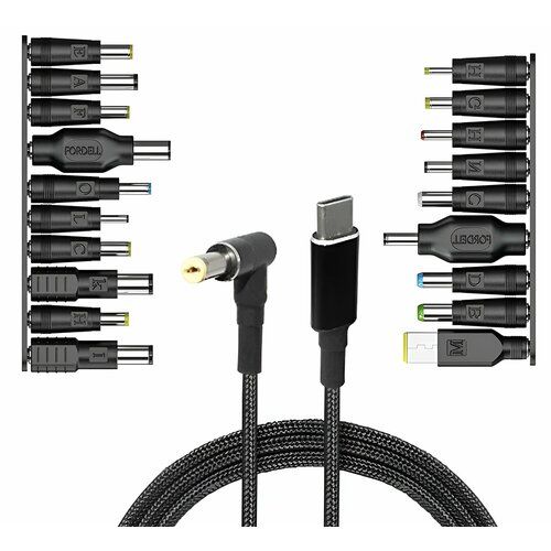 Кабель для зарядки ноутбуков от источника питания USB Type-C с поддержкой быстрой зарядки PD 100W. Позволяет заряжать ноутбуки от USB с помощью встроенного PD Триггера (20V). В комплекте имеется большой комплект из 19 адаптеров различных типов для подключения к ноутбукам, а также кабель питания USB Type-C с коннектором DC5521.