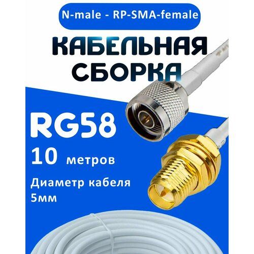 НАЙТИ ВЫГОДНЕЕ - Кабельная сборка 50 Ом на RG-58 белого цвета с разъемами N-male - RP-SMA-female, 10 метров