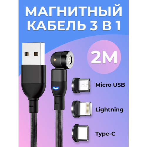 НАЙТИ ВЫГОДНЕЕ - Магнитный кабель 3 в 1, провод 2м, Type-C, Lightning, Micro USB / Зарядка для iPhone, Samsung, Android / Черный