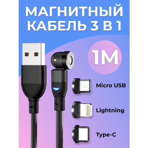 Найти - Магнитный кабель 3 в 1, провод 1м, Type-C, Lightning, Micro USB / Зарядка для iPhone, Samsung, Android / Черный