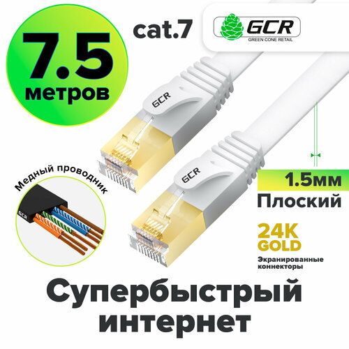 Найти - Патч-корд LAN плоский cat.7 FTP 10 Гбит/с RJ45 для интернета экранированные коннекторы 24K GOLD (GCR-L304) белый 7.5м