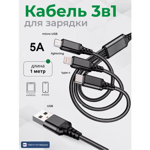 НАЙТИ ВЫГОДНЕЕ - Кабель для быстрой зарядка универсальный 3-в-1 в тканевой оплетке 5А (100Вт)/Type-c, lightning, micro-USB