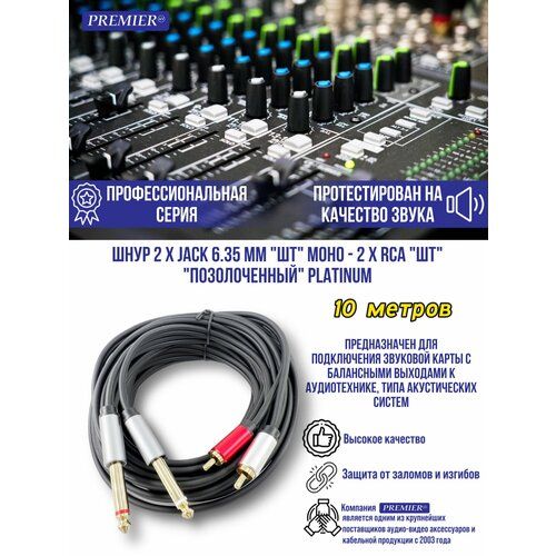 Шнур 2 х Jack 6.35 мм "шт" моно - 2 x RCA "шт" "позолоченный" PLATINUM 10.0 метров - это высококачественный аудио кабель, предназначенный для соединения компонентов звуковой аппаратуры и другого профессионального музыкального оборудования.