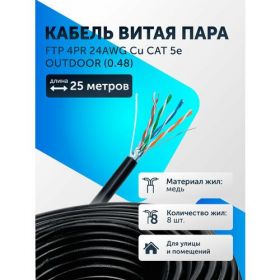 - Интернет кабель уличный витая пара 25м FTP Cat.5e outdoor — надежное решение для подключения к сети в любых условиях. Кабель изготовлен из высококачественных материалов, устойчивых к воздействию влаги, перепадам температур и ультрафиолетовому излучению, подходит как для использования внутри помещений, так и на улице.