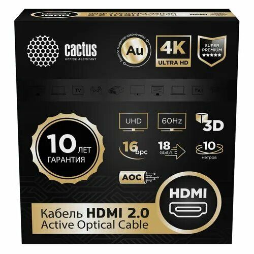 Найти - Кабель аудио-видео Cactus CS-HDMI-AOC-2-10, HDMI (m) - HDMI (m), ver 2.0, 10м, GOLD, черный