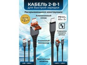 Кабель 2 в 1 USB-С / USB-A - USB-C 60 Вт 3 А 2 м для быстрой зарядки 103296106683
