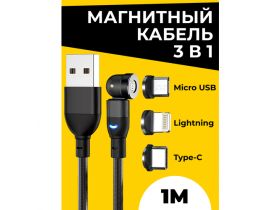USB зарядка 3 в 1 / Micro, Type-C, Lightning / Магнитный кабель 3в1 / Микро юсб, Тайп-С, Лайтнинг / Вращающийся на 540 градусов провод 1м / Черный 102506910446