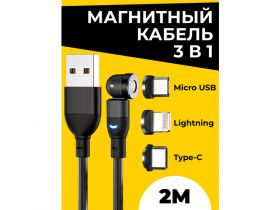 USB зарядка 3 в 1 / Micro, Type-C, Lightning / Магнитный кабель 3в1 / Микро юсб, Тайп-С, Лайтнинг / Вращающийся на 540 градусов провод 2м / Черный 102506910448