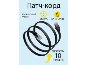 Патч корд 3 метра категория 6 rj45, плоский, черный, сетевой интернет кабель 4324032372