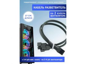 Кабель разветвитель на 2 кулера/вентилятора на 3-4 pin. PWM, 27см чёрный в оплетке, удлинитель вентилятора 102292768312