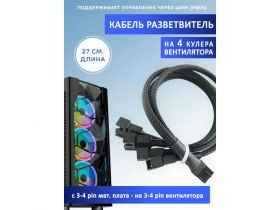 Кабель разветвитель на 4 кулера/вентилятора на 3-4 pin. PWM, 27см чёрный в оплетке, удлинитель вентилятора 102292613155