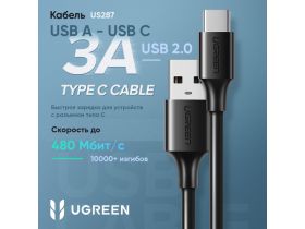 Кабель UGREEN US287 (60826) USB-A 2.0 Male to USB-C Male Cable with Nickel-Plated Connector. Длина: 3м. Цвет: черный 102063515939