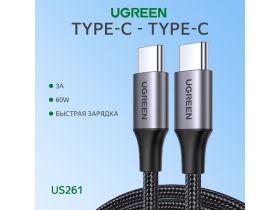 Кабель для зарядки и передачи данных UGREEN US261 USB-С, PD 60 Вт, 3А, цвет черный, 2 метра 4329848697